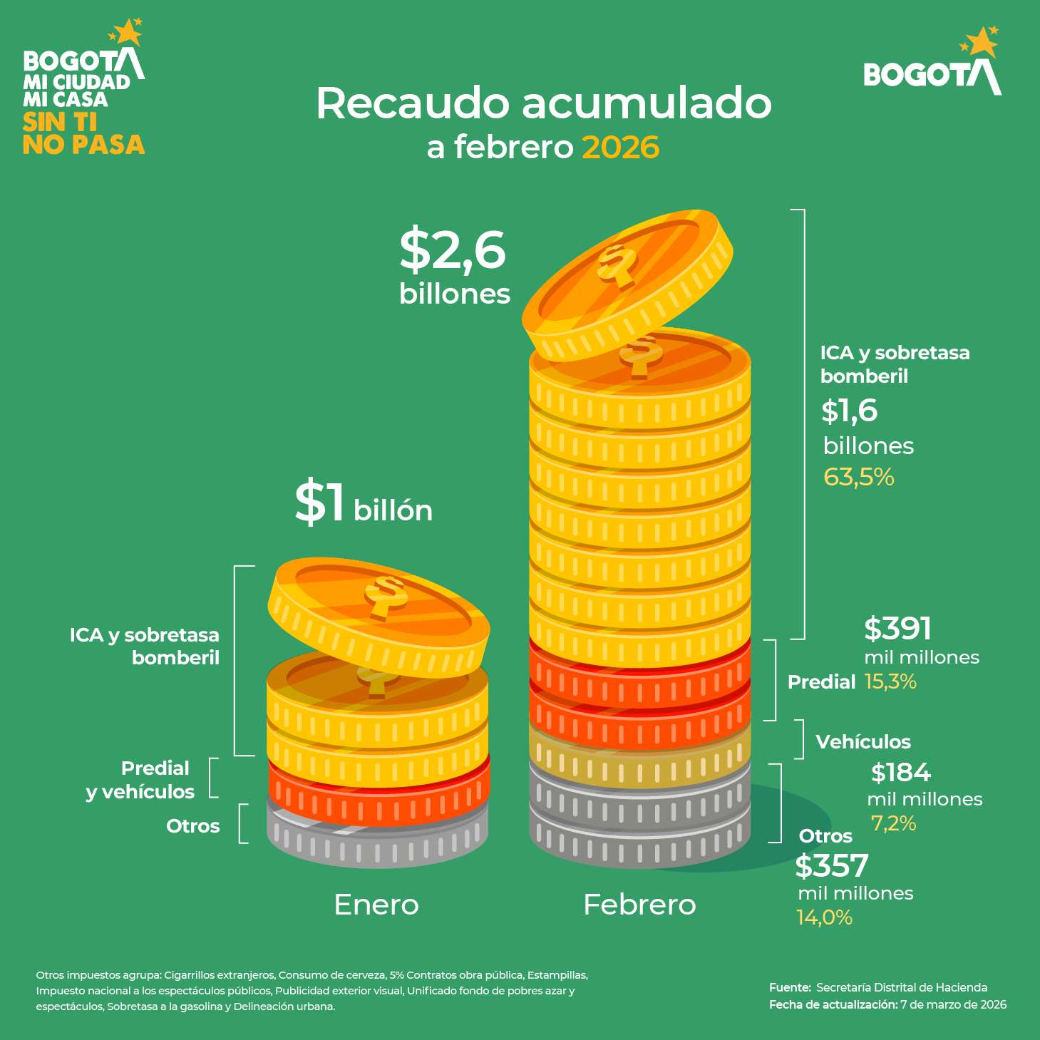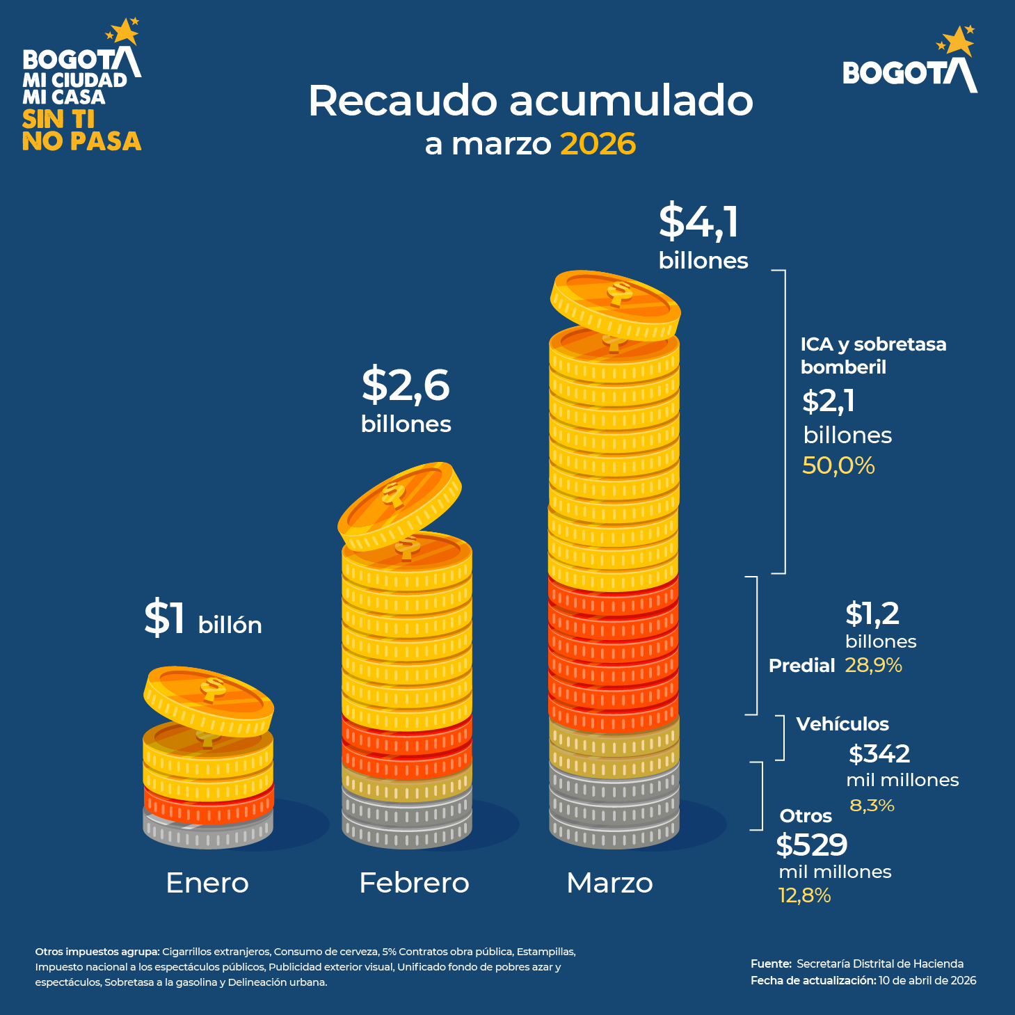 Los impuestos son contribuciones monetarias que brindan a Bogotá gran parte de sus ingresos para financiar el funcionamiento del aparato estatal local y garantizar proveer servicios de carácter público. Así, entre los impuestos distritales que existen en la actualidad se incluyen: Predial, Industria y Comercio (ICA), Vehículos automotores, Delineación urbana y sobretasas a combustibles, administrados por la ciudad. En esta sección encontrarás los indicadores de recaudo por tipo de impuesto vigente en el Distrito Capital.