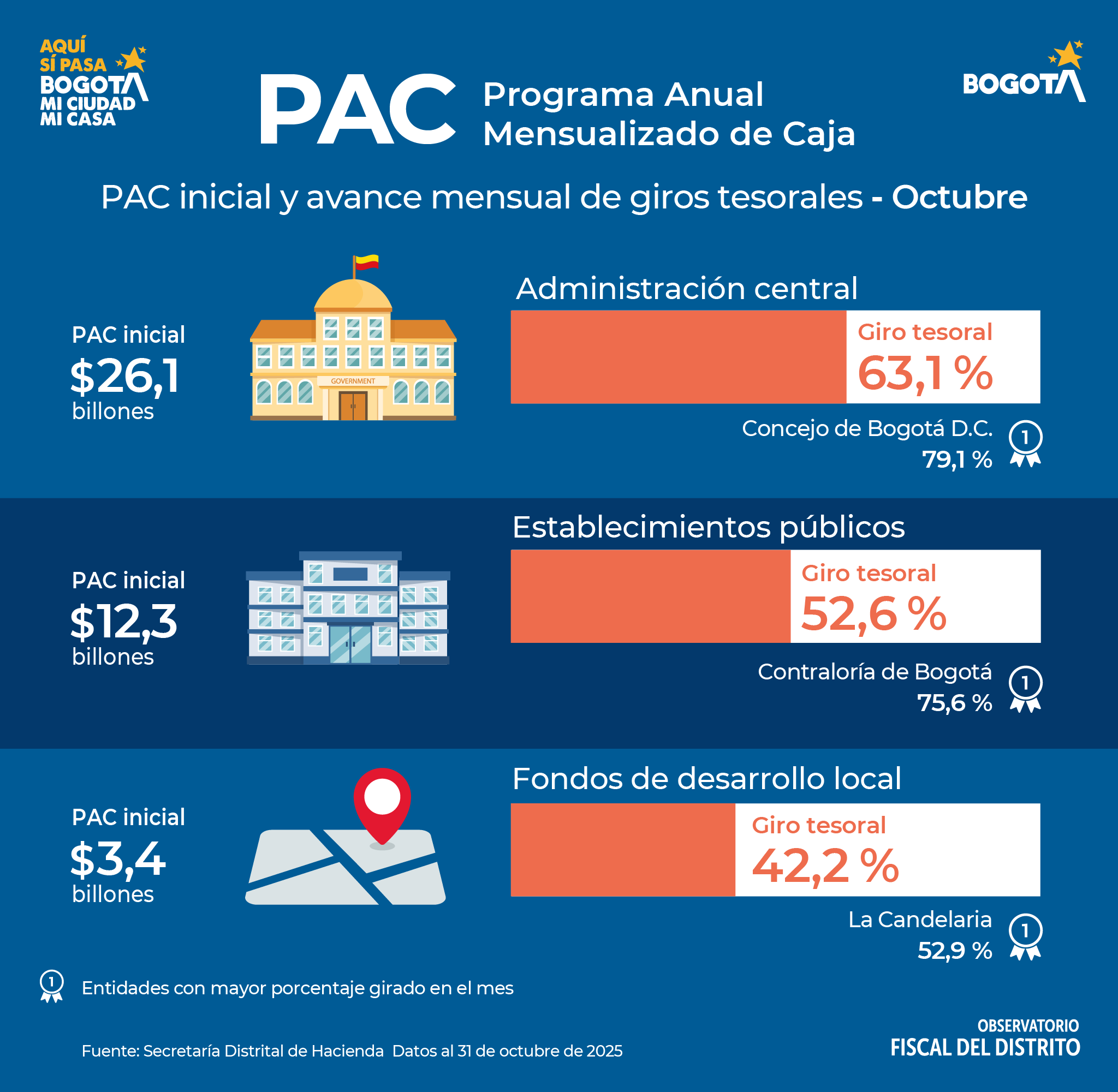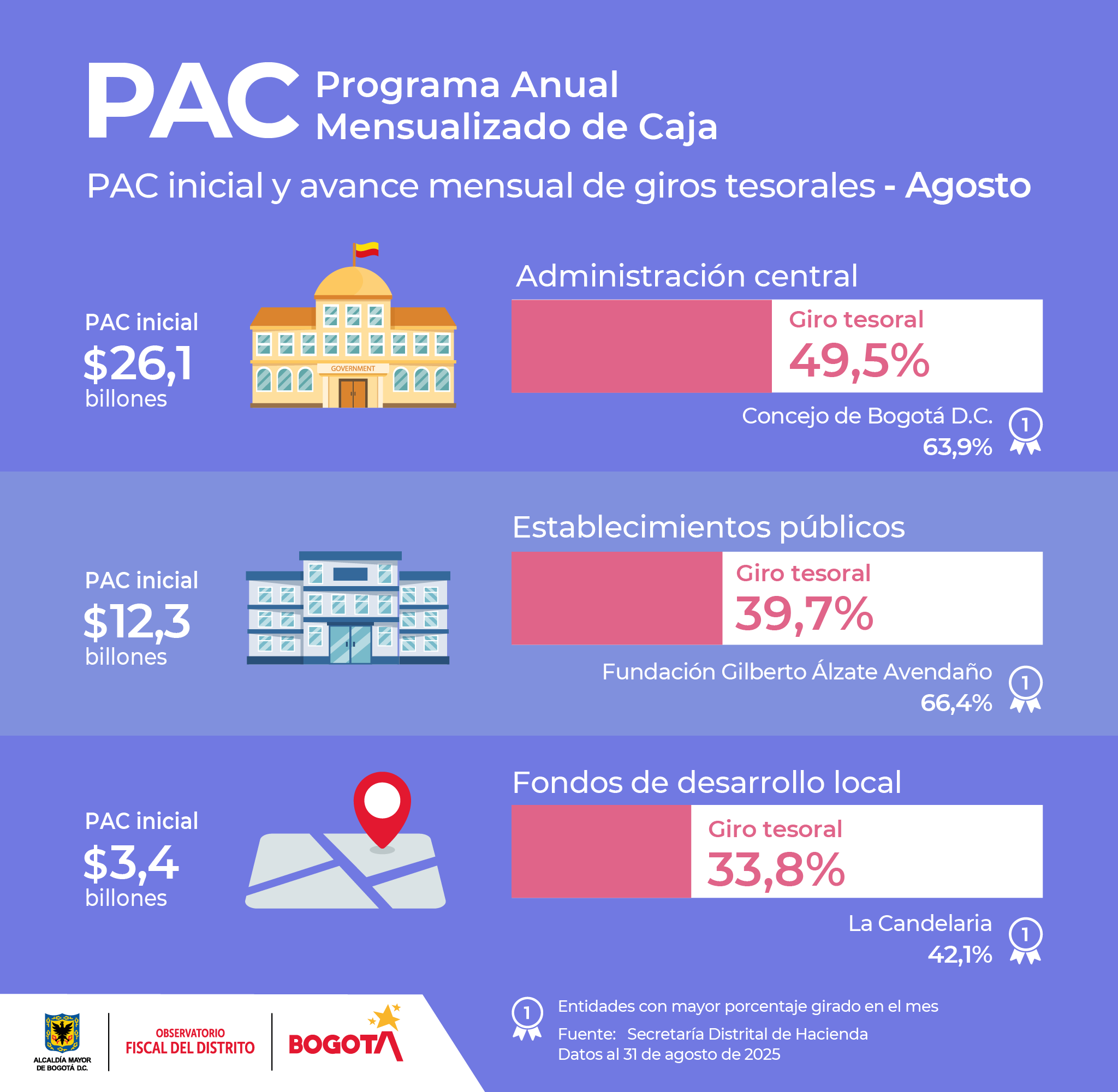 El Programa Anual Mensualizado de Caja - PAC es un instrumento financiero que utilizan las entidades que conforman el Presupuesto Anual del Distrito para gestionar y proyectar sus recursos. En esta sesión encontrarás, el ranking de ejecución acumulado de los recursos de la vigencia programados en el PAC, este se encuentra clasificado entre las entidades de Administración Central, Establecimientos Públicos y Fondos de Desarrollo Local.